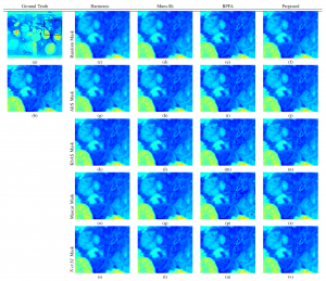 ![]() | Visual Comparison of the reconstructed images using random, AIrS, KbAS, and NetM sampling masks at sampling rate c = 0.2. The first column is the input test image and the second column is the sampling mask, either random, AIrS, KbAS, or NetM, the third column is the sampled image obtained by the sampling mask, and the rest of the columns are the reconstruction results of NetE Inpainting, Harmonic Inpainting, Mumford-Shah Inpainting, and BPFA inpainting respectively. |